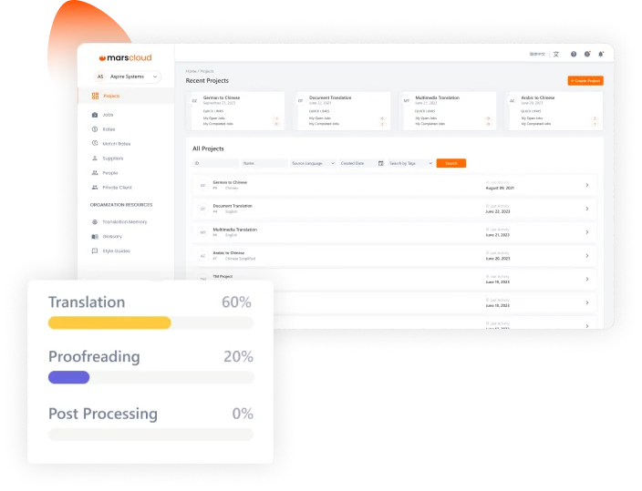 大型、复杂翻译项目不用怕,MarsCloud帮你轻松搞定。项目全体成员和所有参与方在这个系统上,可以实时沟通、无缝协作,确保高效交付质量过硬的本地化产品。
