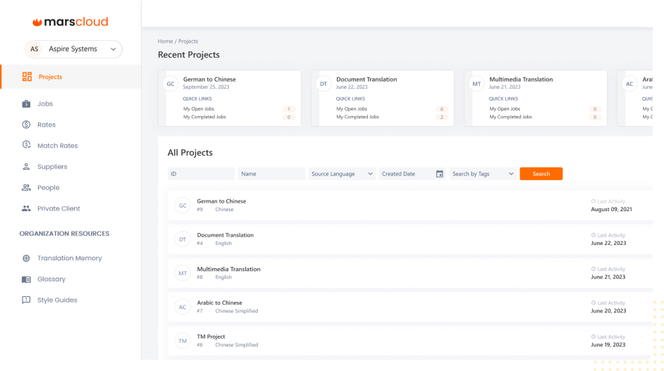 MarsCloud使本地化流程中的每个人都能随时查找和跟踪自己的本地化项目并共享资源、集中处理和无缝协作,从而更快更省更高效地交付高质量项目。